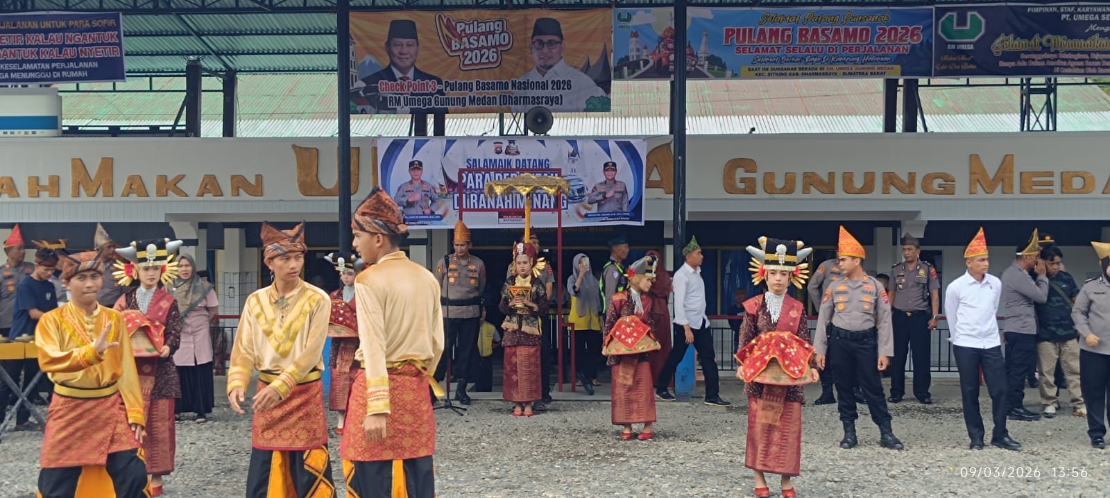 Sumbar | Kepolisian Daerah Sumatera Barat (Polda Sumbar) menunjukkan komitmen pelayanan humanis dalam menyambut kepulangan warga perantau Minang. Kloter pertama program Pulang Basamo 2026 resmi disambut di Rumah Makan Omega Gunung, Kecamatan Sitiung, Kabupaten Dharmasraya, Senin (9/3/2026) sore.